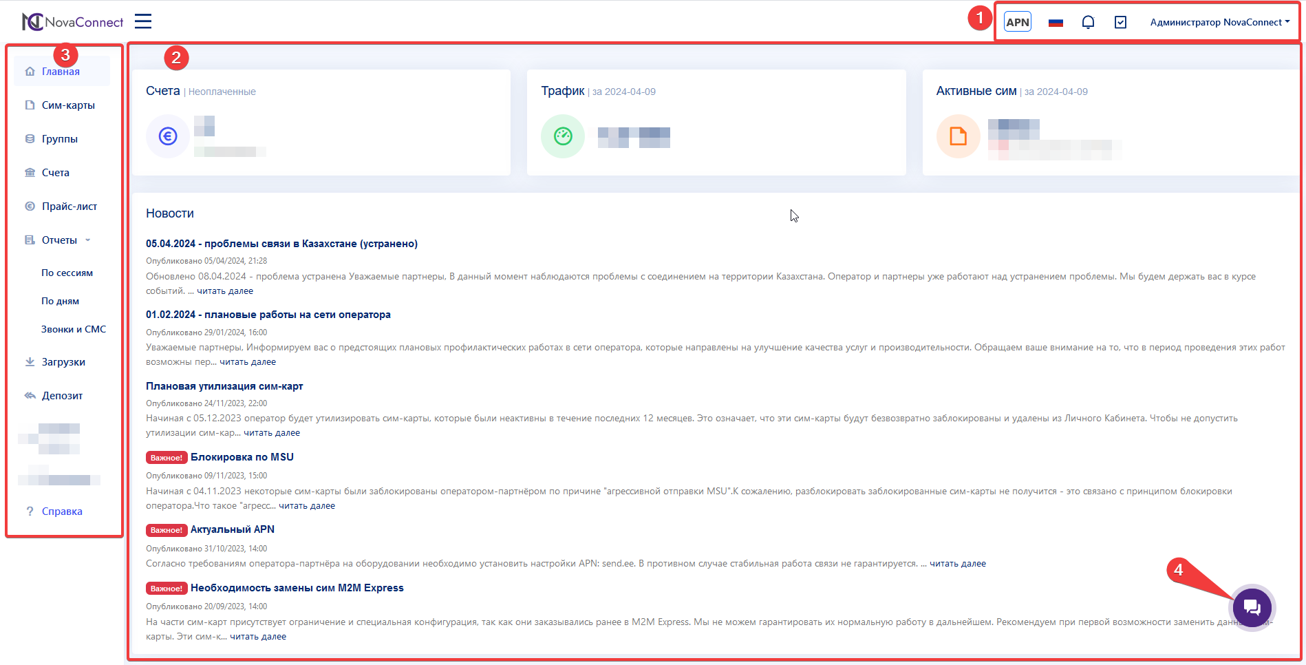- Верхняя часть, содержащая в сете виджеты уведомлений и заданий, информации о текущем пользователе и информацию об APN для сим-карт;